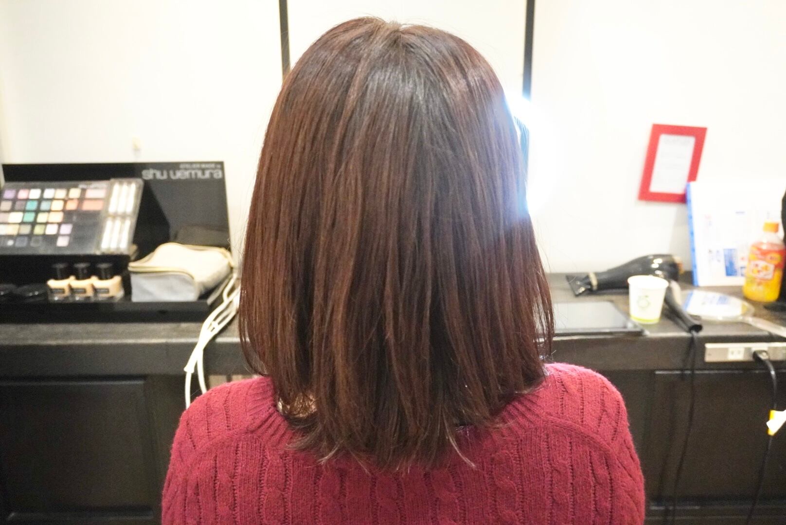 601作目は社会人の方のイメージチェンジに密着し、腰近くまであるロングヘアを3年ぶりにセミロングの長さまでバッサリとカットし、同時にカラーリングを行いました。