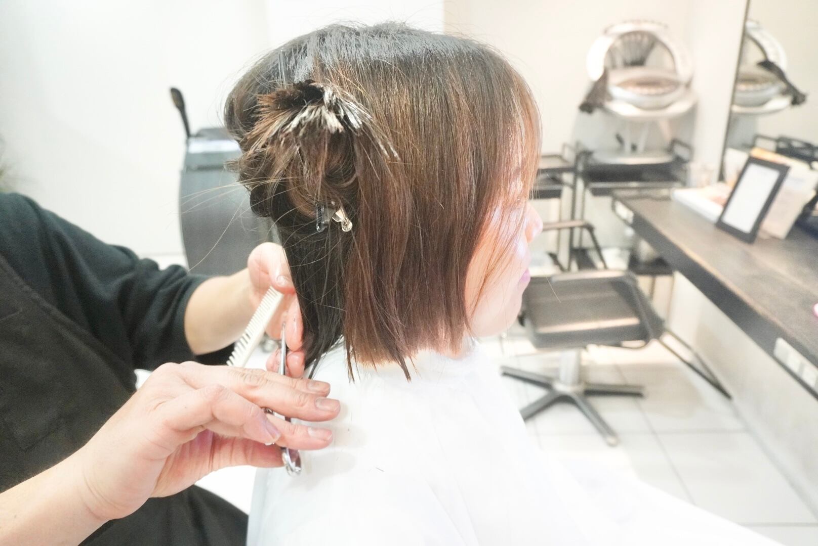 胸下ロングヘアをバッサリと学生以来のショートボブヘアにカットし、カラーリングも行って明るめのベージュ系カラーに仕上げて雰囲気がガラリと変わりました!