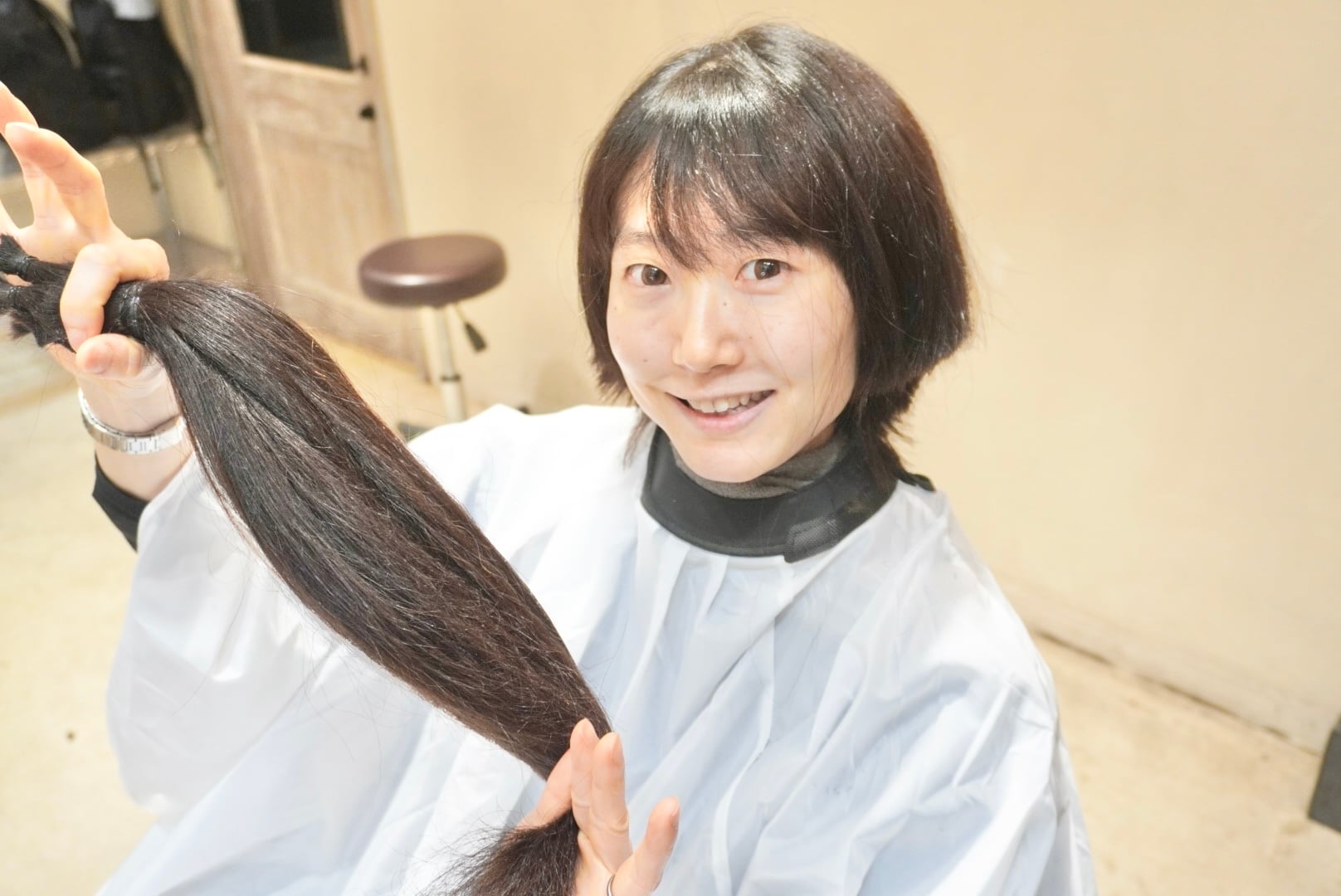 切った髪束は40cm近くあり、全てヘアドネーションさせて頂きます。