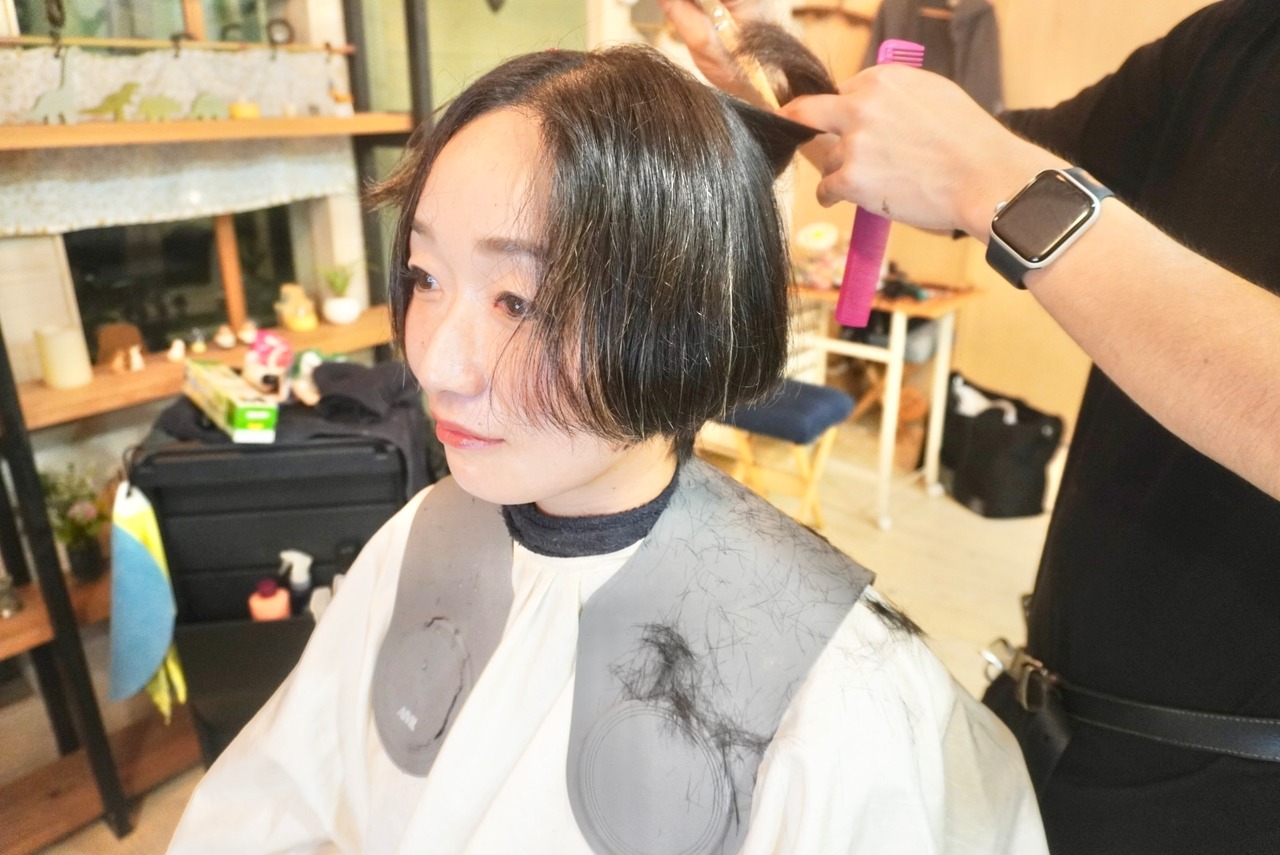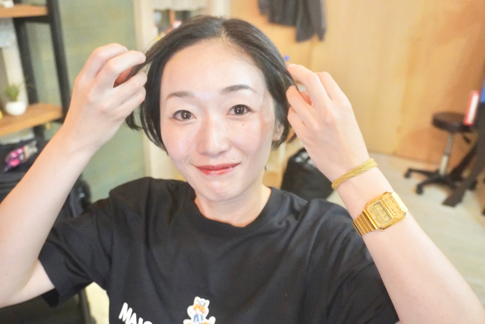 前回撮影時から伸びた髪をバッサリとハンサムショートヘアにカットし、縮毛矯正を行って仕上げました!