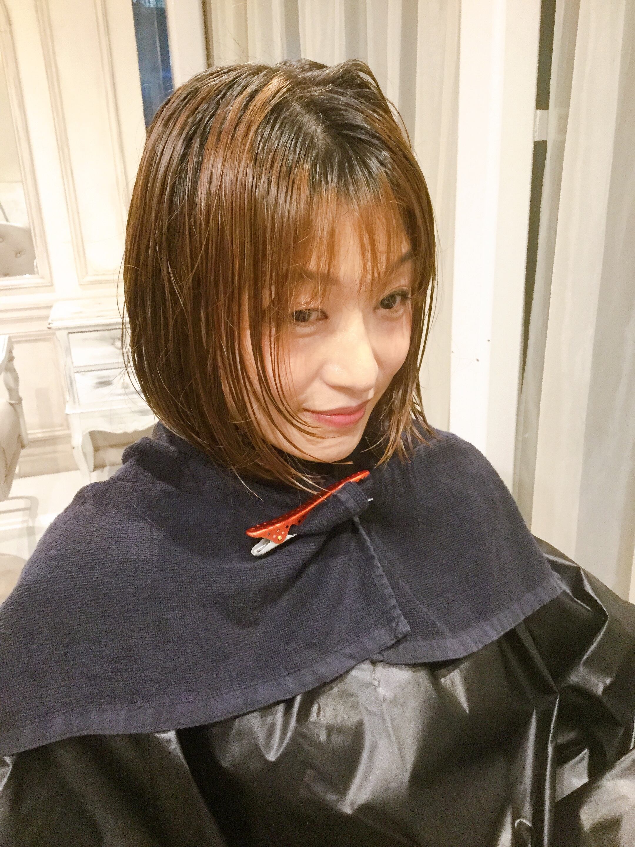 スーパーロングヘアをボブヘアまでカットし、暗めのグラデーションカラー