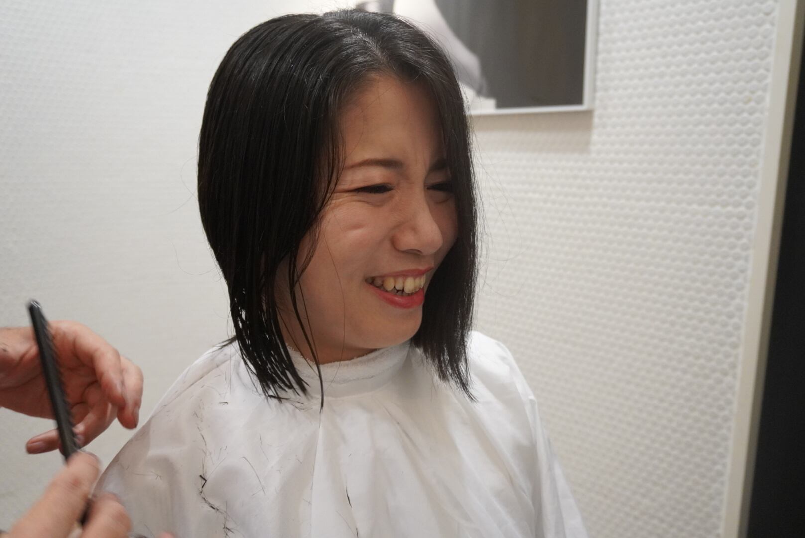 ロングヘアを前下がり気味のショートスタイルまでバッサリカット