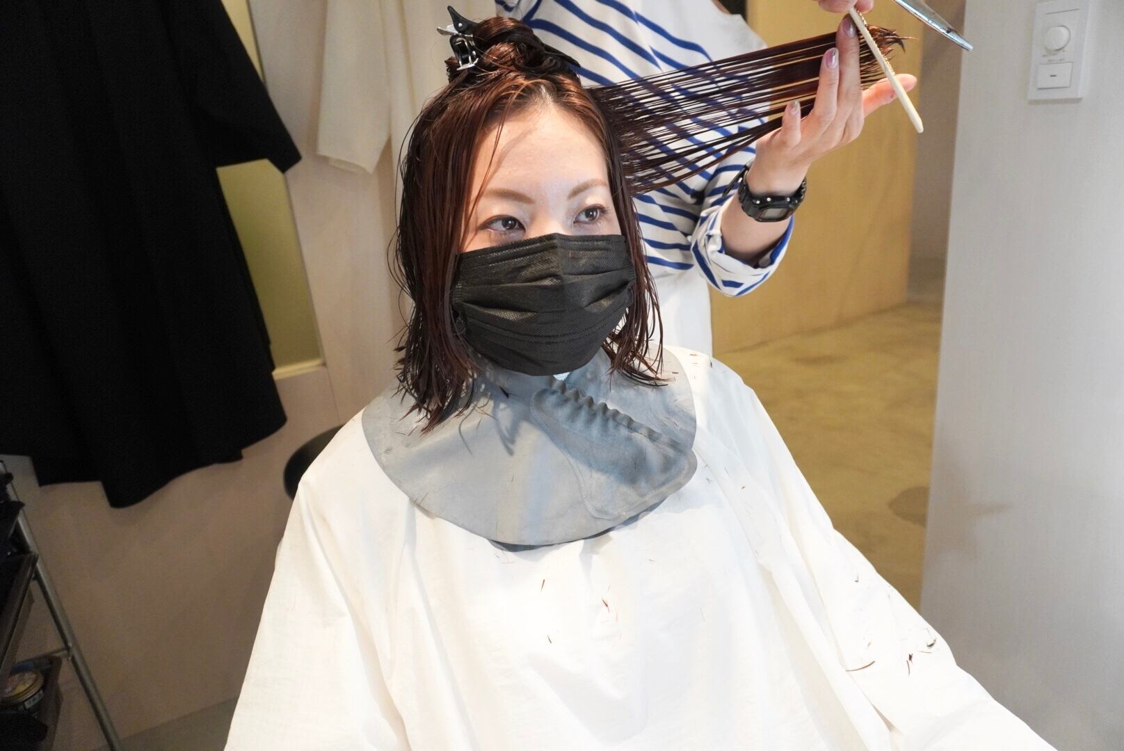 2年ぶりにロングヘアを前回よりも短めのミディアム系レイヤースタイルにカットし、大変身されました!※今回も顔出しNGです