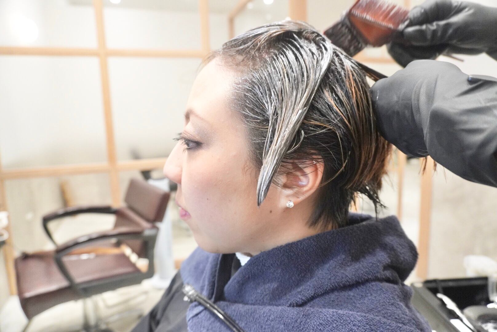 ロングヘアを人生最短の耳出しショートヘアに思い切ってバッサリカットし、同時にグレージュ系のハイライトカラーも入れてガラリとイメチェン!