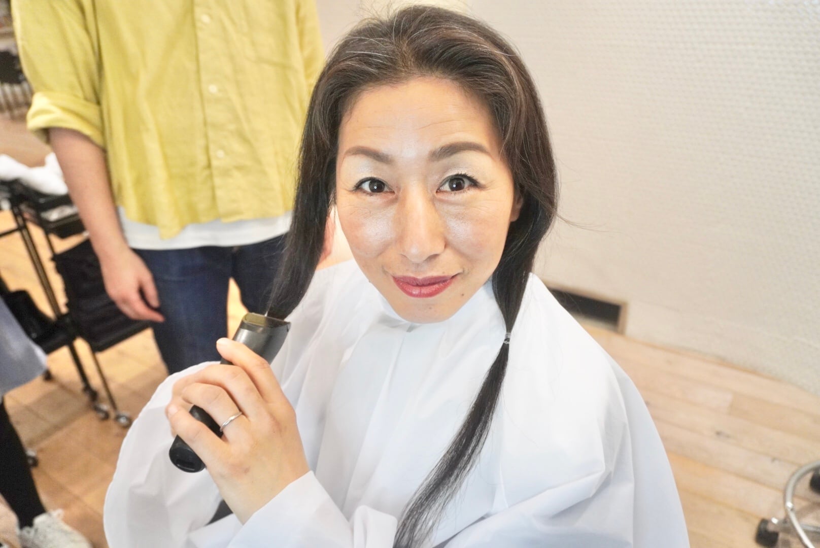 娘様は膝近くのスーパーロングヘアを胸上のセミロングヘアまでバッサリ切って大変身