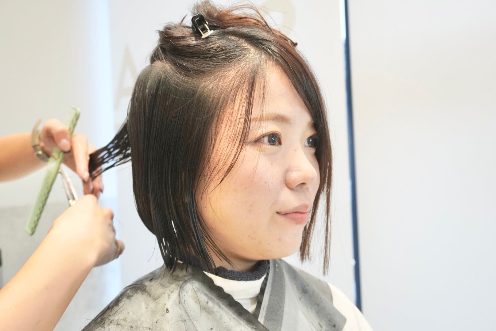 4年近く伸ばしたロングヘアをバッサリとカットし、前下がりボブヘアに初挑戦されました今回は同時にベージュ系のカラーリングも行いました