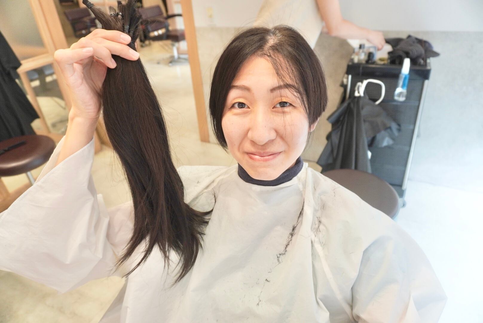 切った髪束は40cm近くあり、全てヘアドネーションし、モデル様3回目のヘアドネーションに挑戦されました!