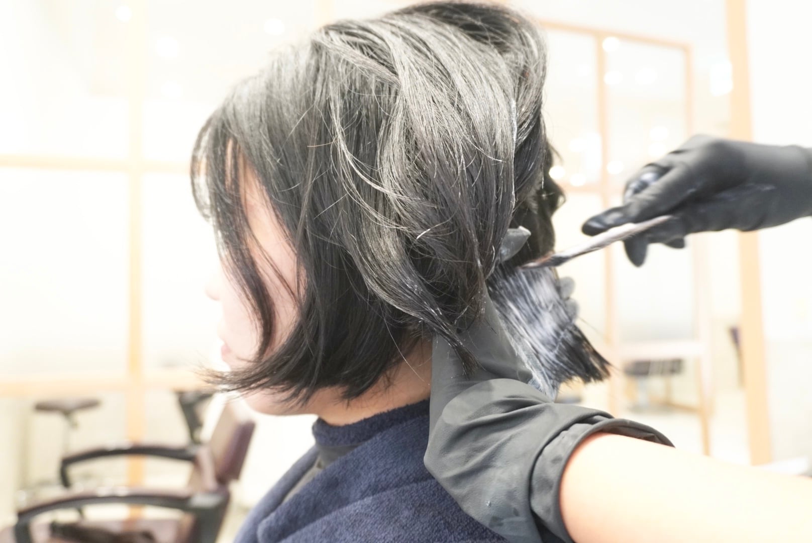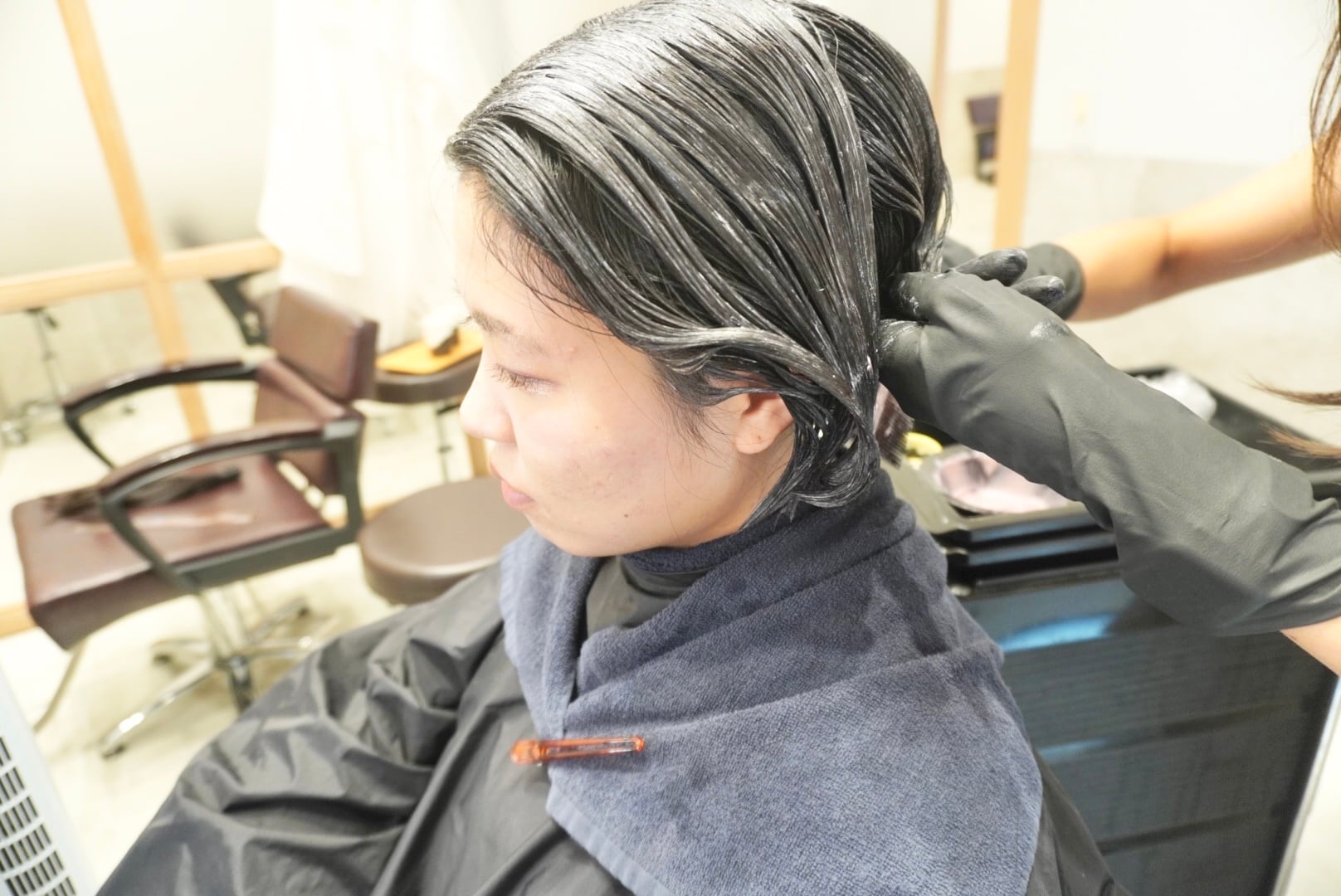 今回は同時にカラーも行い、アッシュ系のカラーにバイオレットの色味を加えて艶髪に大変身されました