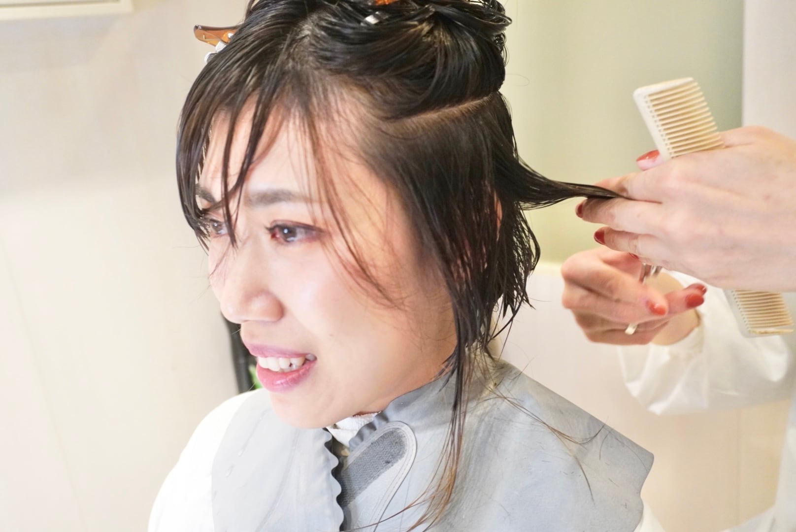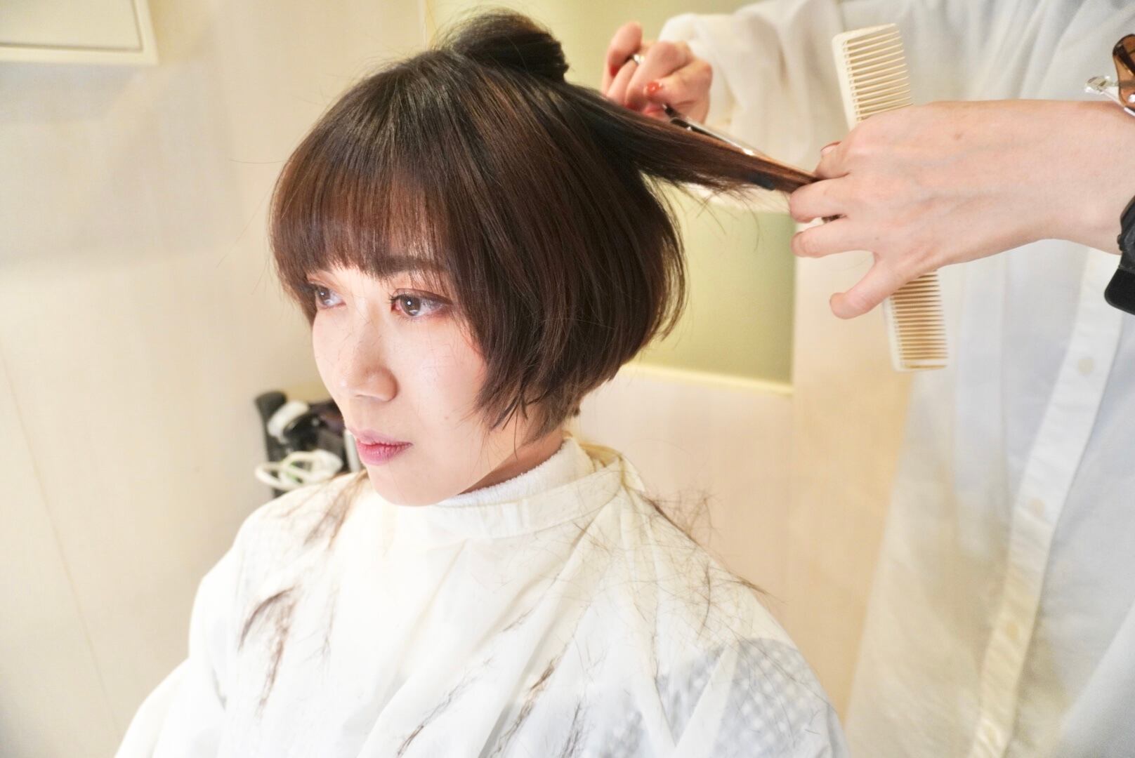 胸下ロングヘアをスッキリと丸みを帯びたショートヘアにカットし、雰囲気が一気に変わりました!