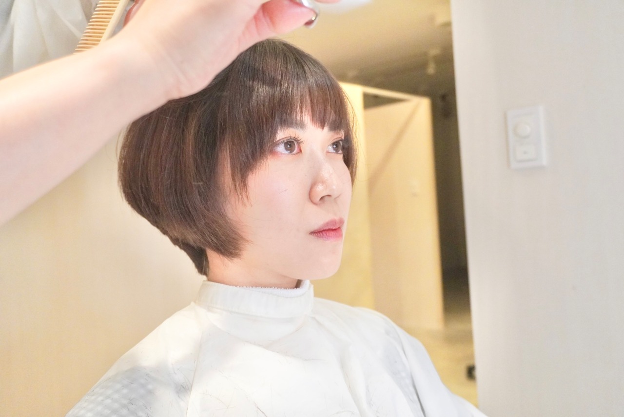 胸下ロングヘアをスッキリと丸みを帯びたショートヘアにカットし、雰囲気が一気に変わりました!