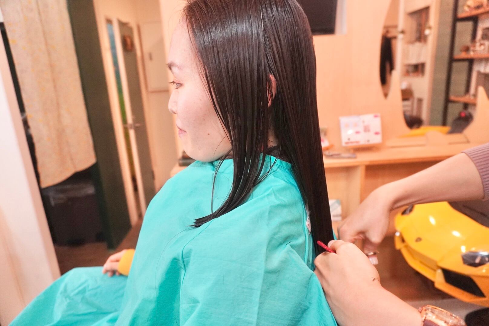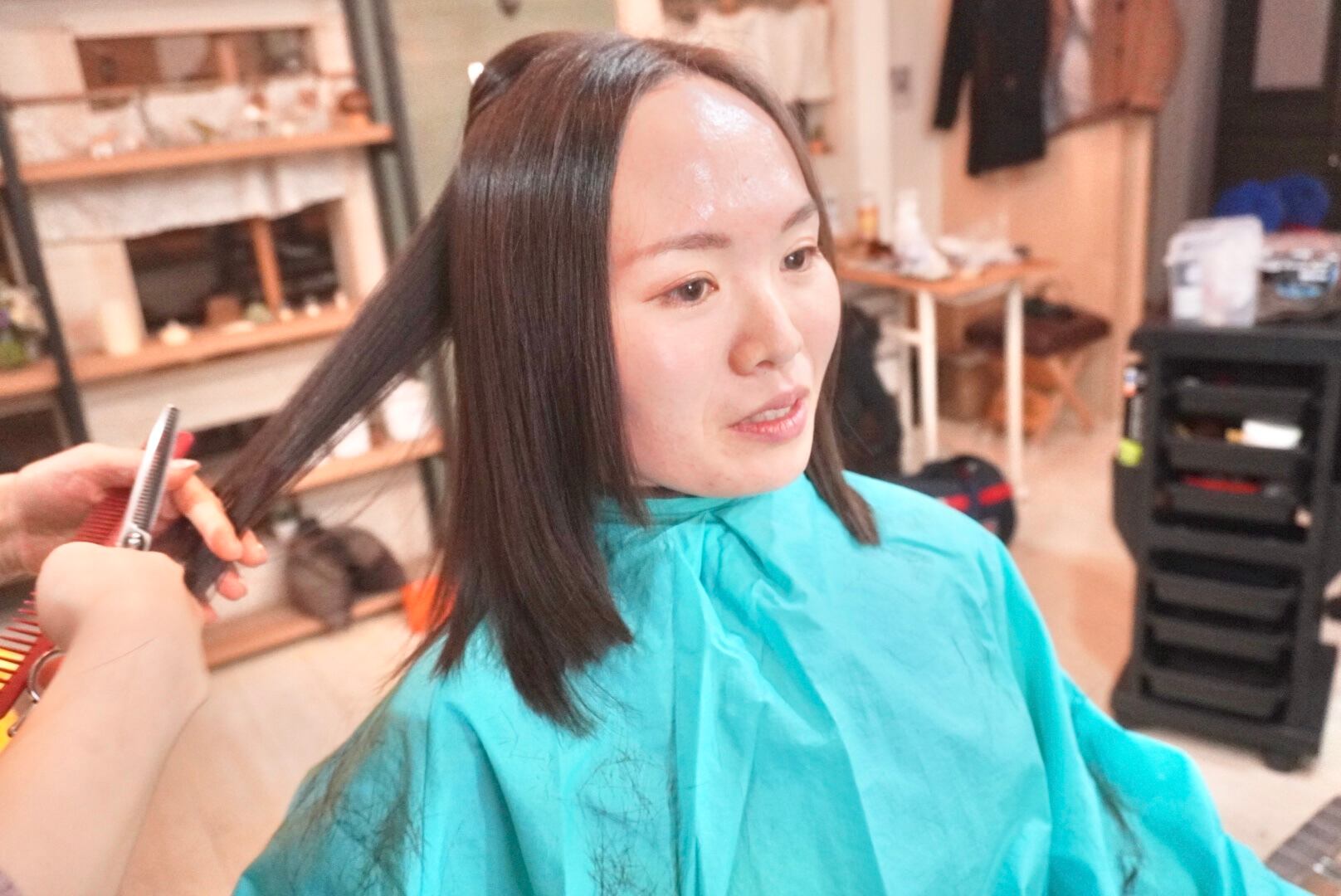 前回撮影から4年近く伸ばした髪を伸ばしやすいミディアムスタイルにカットし大変身されました!切った髪束は35cm近くあり、当企画にて3回目のヘアドネーションに挑戦されました