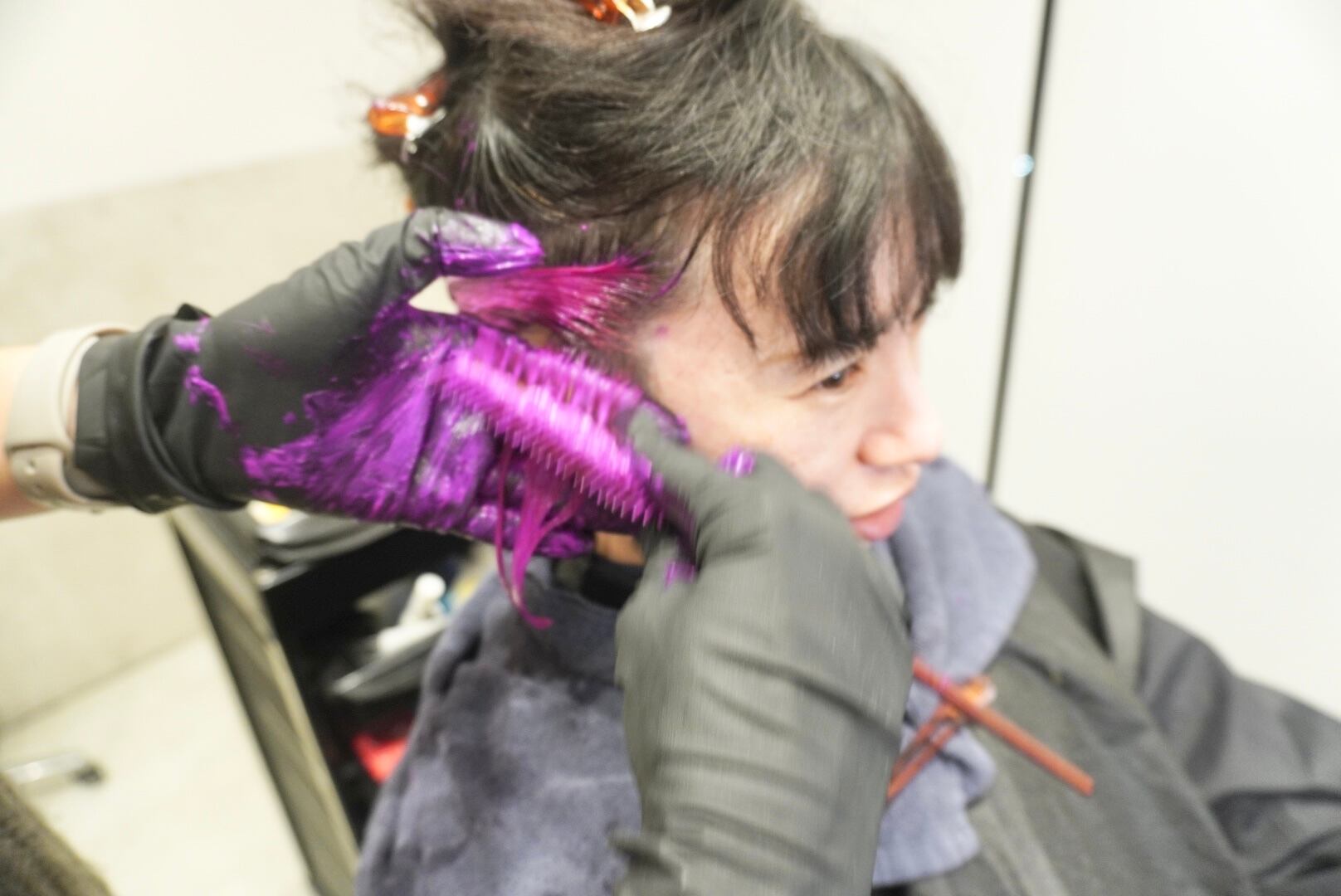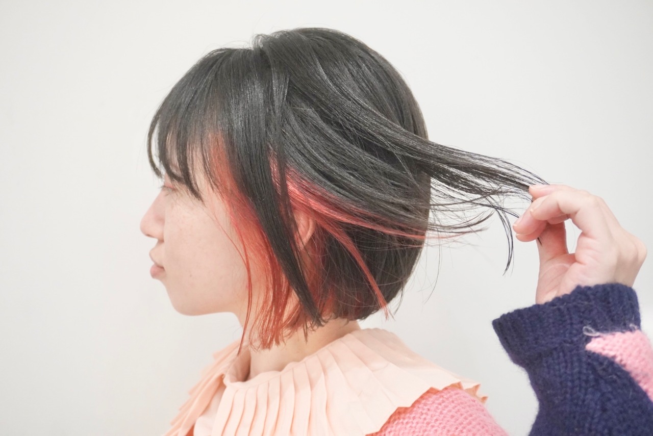 スーパーロングヘアを思い切ってボブヘアにバッサリとカットし、同時にブリーチでピンク系のインナーカラーにカラーリングを行いました‼️