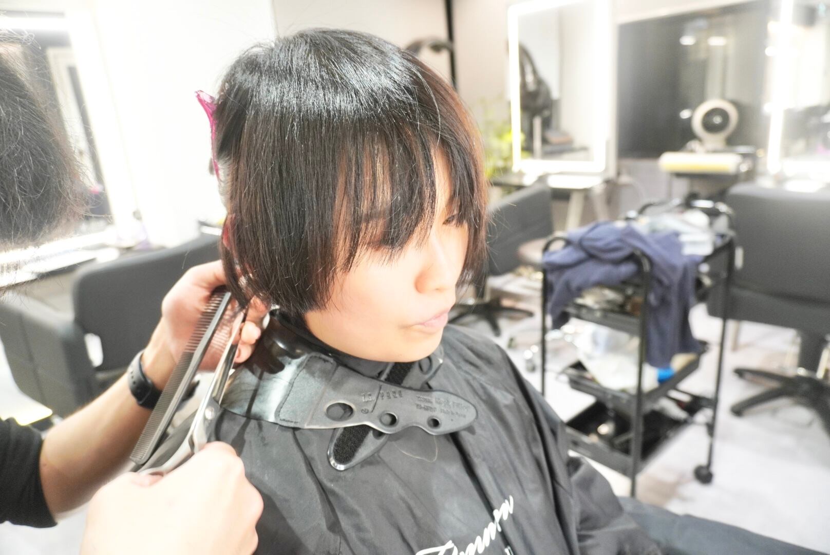 ロングヘアをバッサリとマッシュ系のショートヘアにカットし、同時に黒染めカラーリングを行いました