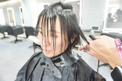 ロングヘアをバッサリとマッシュ系のショートヘアにカットし、同時に黒染めカラーリングを行いました