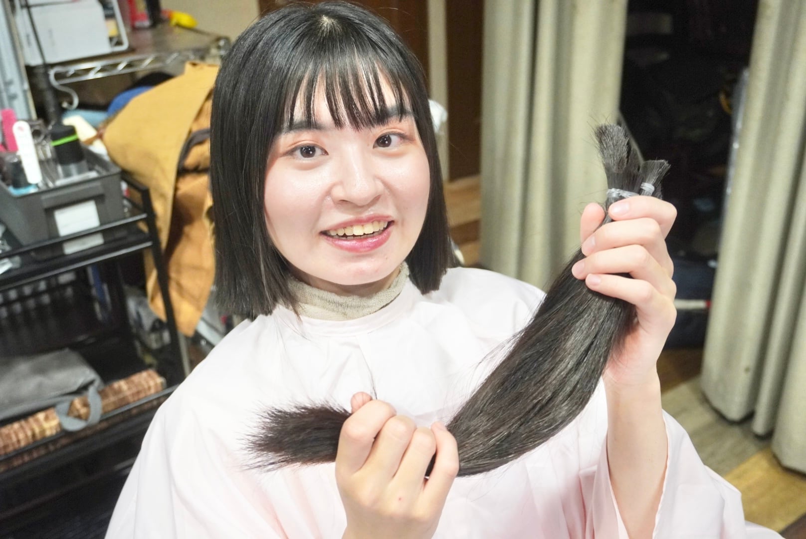 切った髪束は32cm〜35cm弱あり、モデル様念願のヘアドネーションに挑戦しました。
