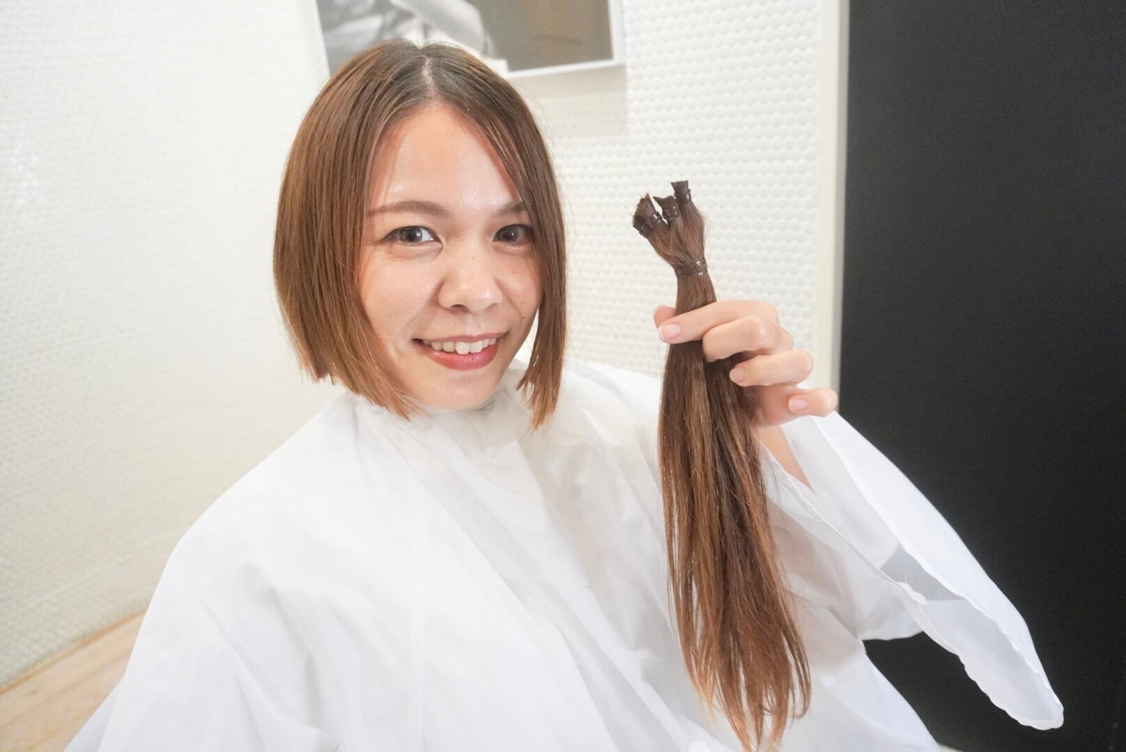 切った髪束は35cm近くあり、全てヘアドネーションさせて頂きます。