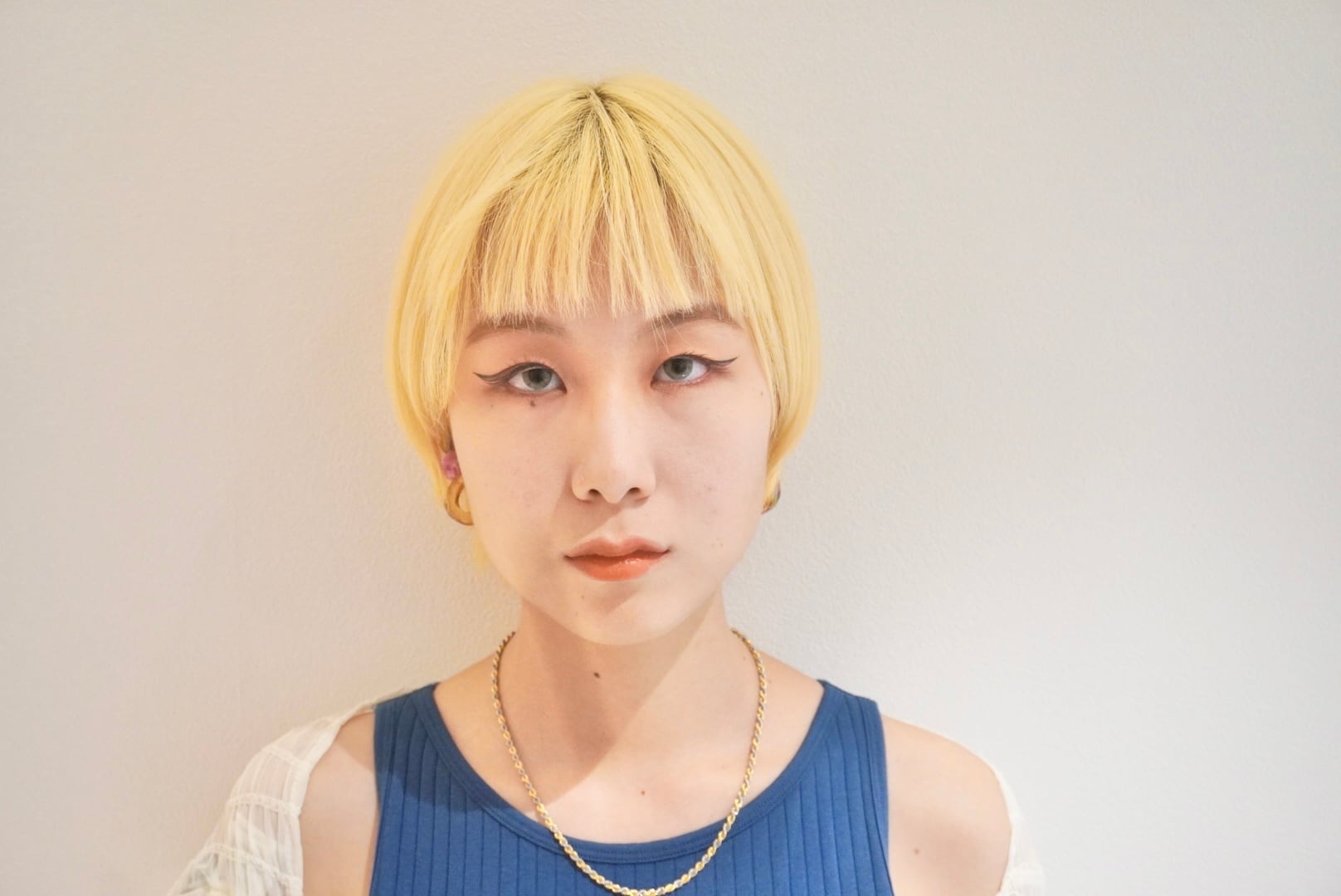 事前にブリーチした金髪ショートボブヘアを人生最短のバズカットにバッサリとカットし、ブリーチカラーを一部塗り直してコーラルピンクカラーでカラーリングさせて頂きました❕