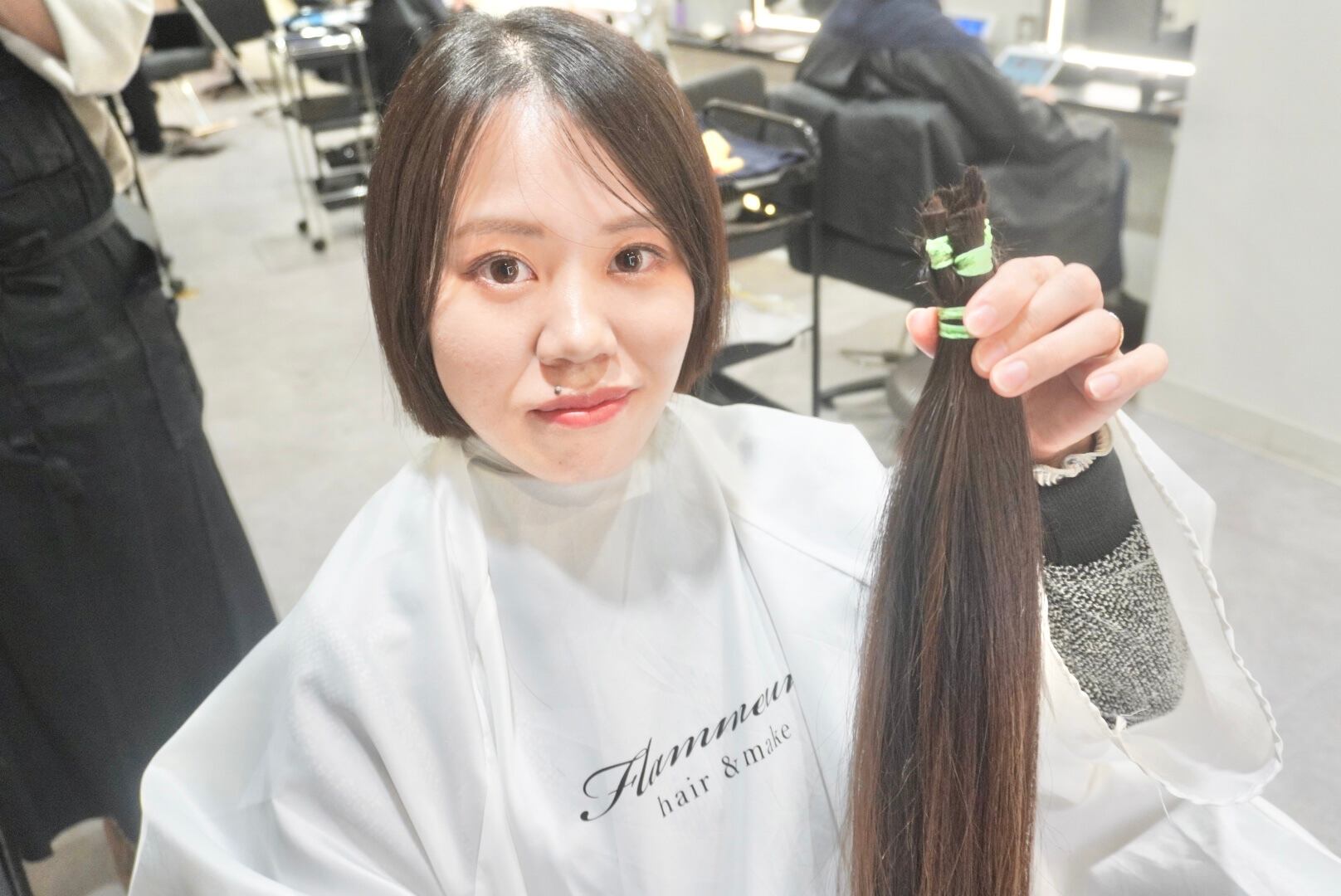 切った髪束は45cm〜50cm近くあり、全てヘアドネーションさせて頂きました。